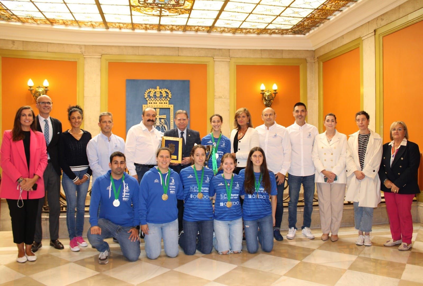 Al encuentro, en el que también ha estado presente la concejal de Deportes del Ayuntamiento de Oviedo, Concepción Méndez, han asistido el presidente de la entidad, Nicolás García; el directivo Ángel Rodríguez; el director técnico del club, César González; la entrenadora Isela Miranda; y el capitán del primer equipo, Alberto Zapico. Los miembros del club han hecho entrega al alcalde de la medalla de campeones de Liga.