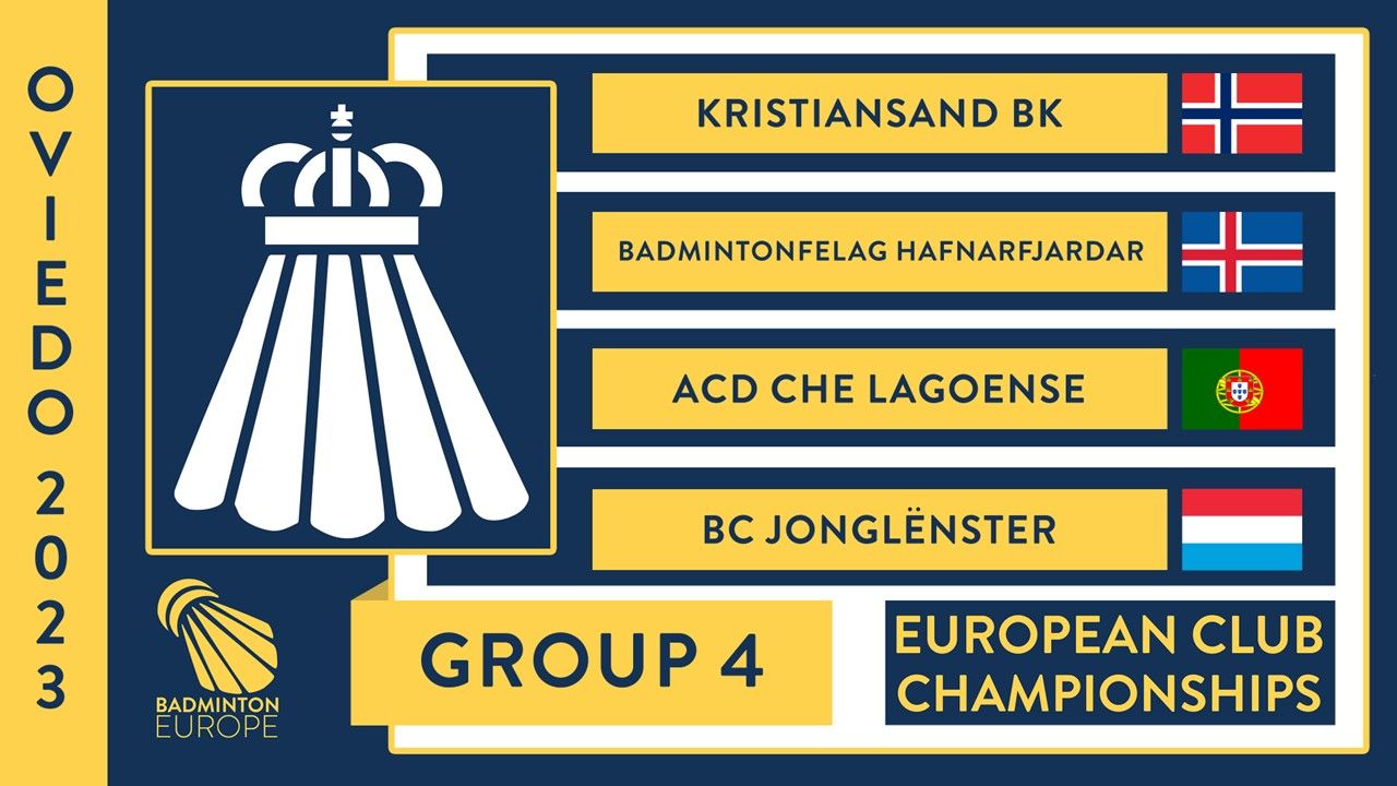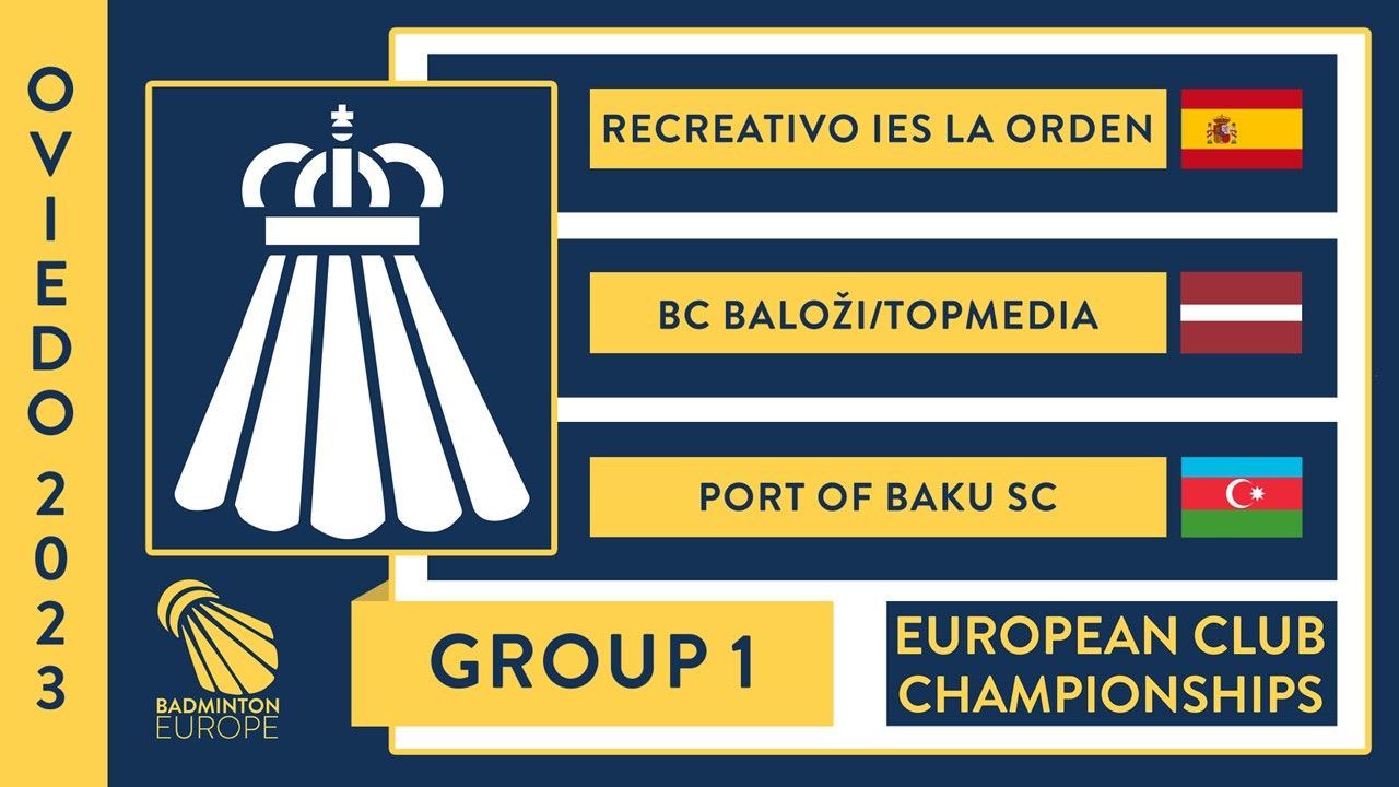 Hoy se han anunciado los grupos del Campeonato Europeo de Clubes que se llevará a cabo en el Pabellón Corredoria Arena del 19 al 23 de junio. El Bádminton Oviedo, equipo anfitrión de la competición ha sido asignado al Grupo 2 junto con Matex Marabadminton de Italia, quien encabeza el grupo como cabeza de serie número dos, y CDR Prazeres de Portugal.